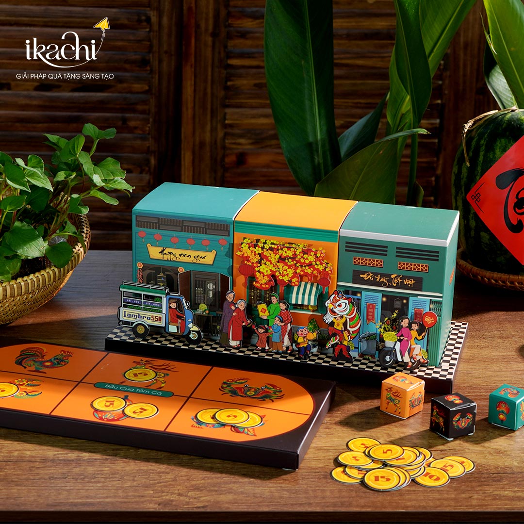 Đặc biệt, Ikachi còn mang cả không khí rộn rã của Tết xưa về trong tay bạn với bộ trò chơi dân gian Bầu Cua Cá Ngựa, khéo léo lồng ghép trong hộp quà. Trò chơi không chỉ đem đến niềm vui đầu năm mà còn là biểu tượng của tài lộc và sum vầy. Mỗi lần gieo xúc xắc, từng con số, từng hình ảnh đều như gieo trọn niềm hy vọng, gửi gắm ước vọng cho một năm mới sung túc, đủ đầy và tràn đầy hạnh phúc.