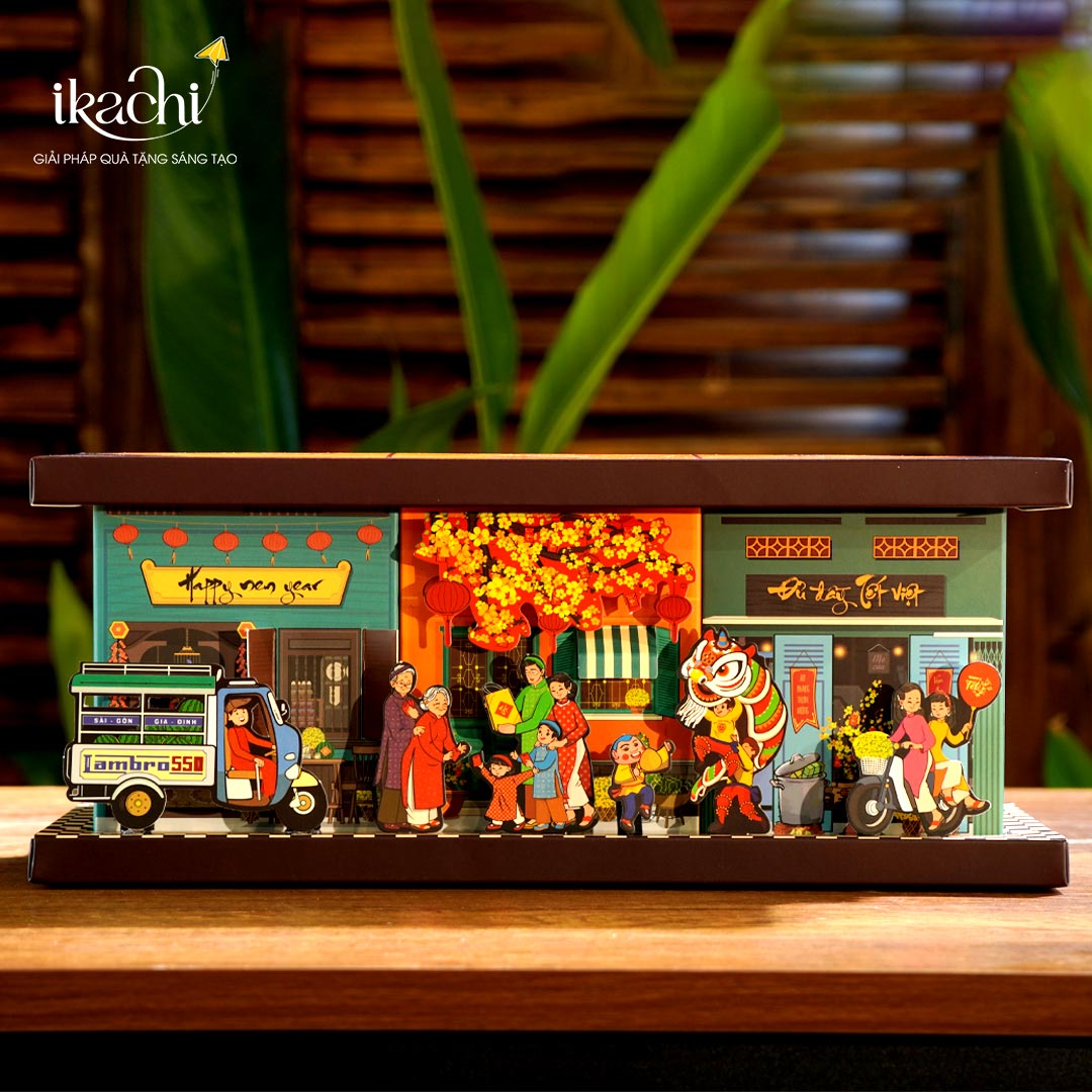 Bộ Quà Tết Xanh Ikachi “Chúc Tết” như tái hiện cả một khu phố Tết rực rỡ, nơi hoa mai vàng, hoa cúc trắng, chậu quất xanh, dây pháo đỏ và câu đối thắm sắc trang hoàng khắp mọi nẻo đường. Mỗi chi tiết gợi nhớ những ngày sum họp đầy ắp yêu thương, về sự ấm áp của gia đình và tình làng nghĩa xóm gắn bó qua bao thế hệ.
