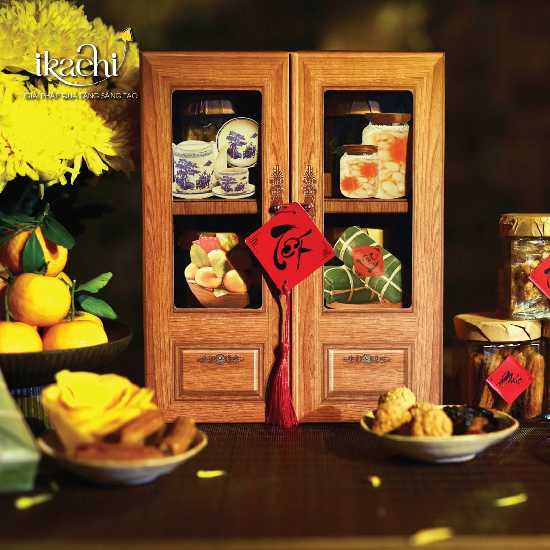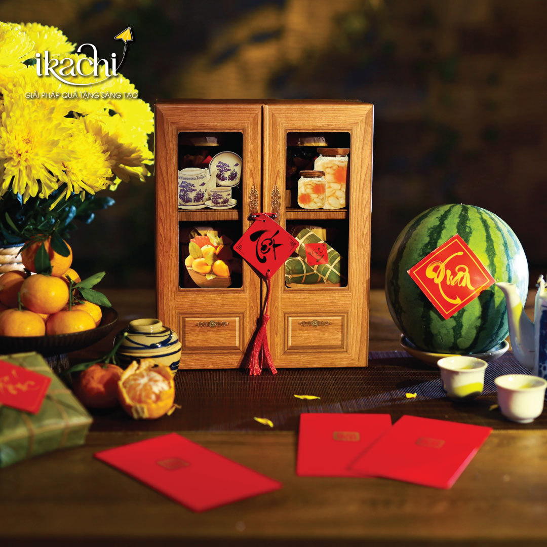 Mở cánh tủ ra, người ta bắt gặp một thế giới thân quen như chính gian bếp của mẹ ngày Tết. Đó là bộ ấm chén sứ men ông bà thường nâng niu bày biện để mời khách đầu năm; là lọ củ kiệu mẹ tự tay muối từ những ngày cận Tết, thơm nồng, giòn rụm; là đôi đòn bánh tét cả nhà thức canh suốt đêm bên bếp lửa, nghe lửa reo tí tách trong niềm háo hức đợi chờ; và là mâm quýt vàng căng mọng được đặt trang trọng trên bàn thờ để dâng lên ông Công ông Táo, gửi gắm lời cầu mong một năm mới an khang, tươi tốt.