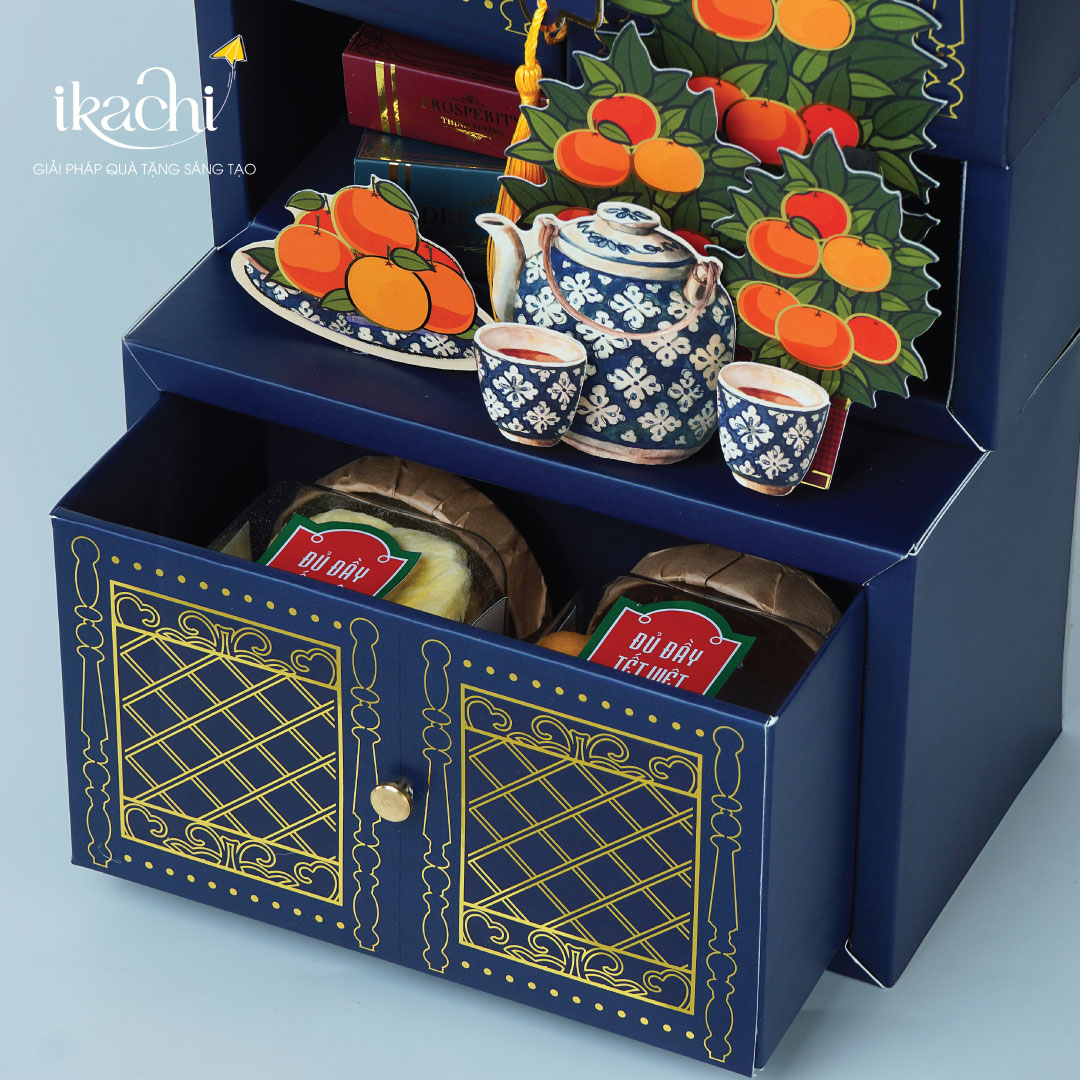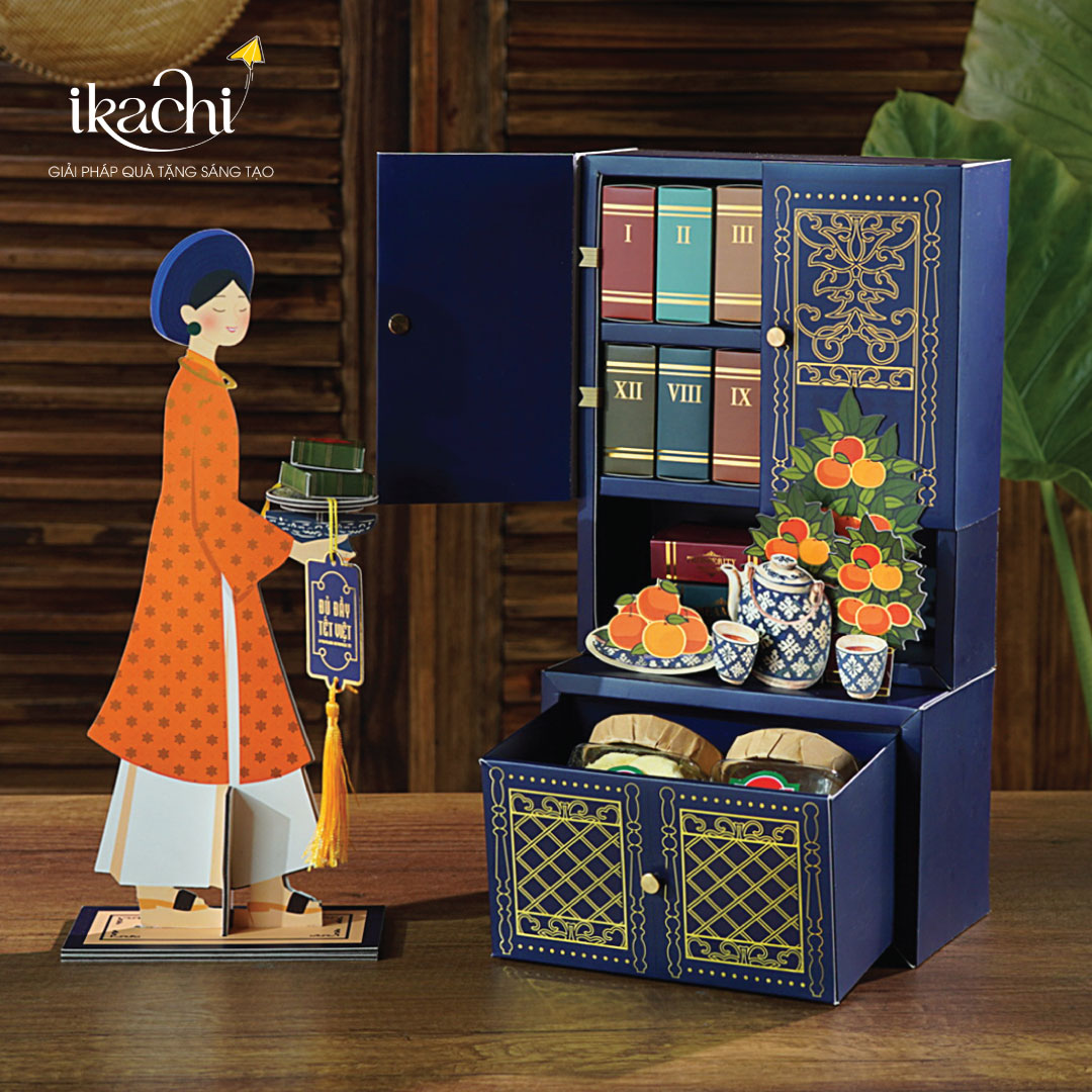 Bên trong chiếc tủ chứa đựng 12 hộp sách tượng trưng cho 12 tháng trong năm, mỗi cuốn là một lời chúc tốt lành, một mong ước an nhiên gửi gắm cho người nhận. Mở từng hộp sách, ta sẽ bắt gặp những hương vị mứt Việt – mộc mạc mà tinh tế, được chế biến từ những nông sản quê hương trọn vị: từ xoài sấy dẻo làm nên từ những lát xoài Cát Hòa Lộc Tiền Giang vàng óng, đến khoai môn sấy tỏi ớt cay cay mằn mặn – đặc sản núi rừng Yên Bái, hay gừng non sấy mang hơi ấm nồng nàn của vùng Tây Bắc... Mỗi hương vị không chỉ là niềm tự hào của Ikachi dành cho nông sản Việt, mà còn là tấm chân tình dịu dàng gửi trao đến mỗi vị khách – như lời chúc 12 tháng trong năm mới đều hạnh phúc, yên vui và đủ đầy.