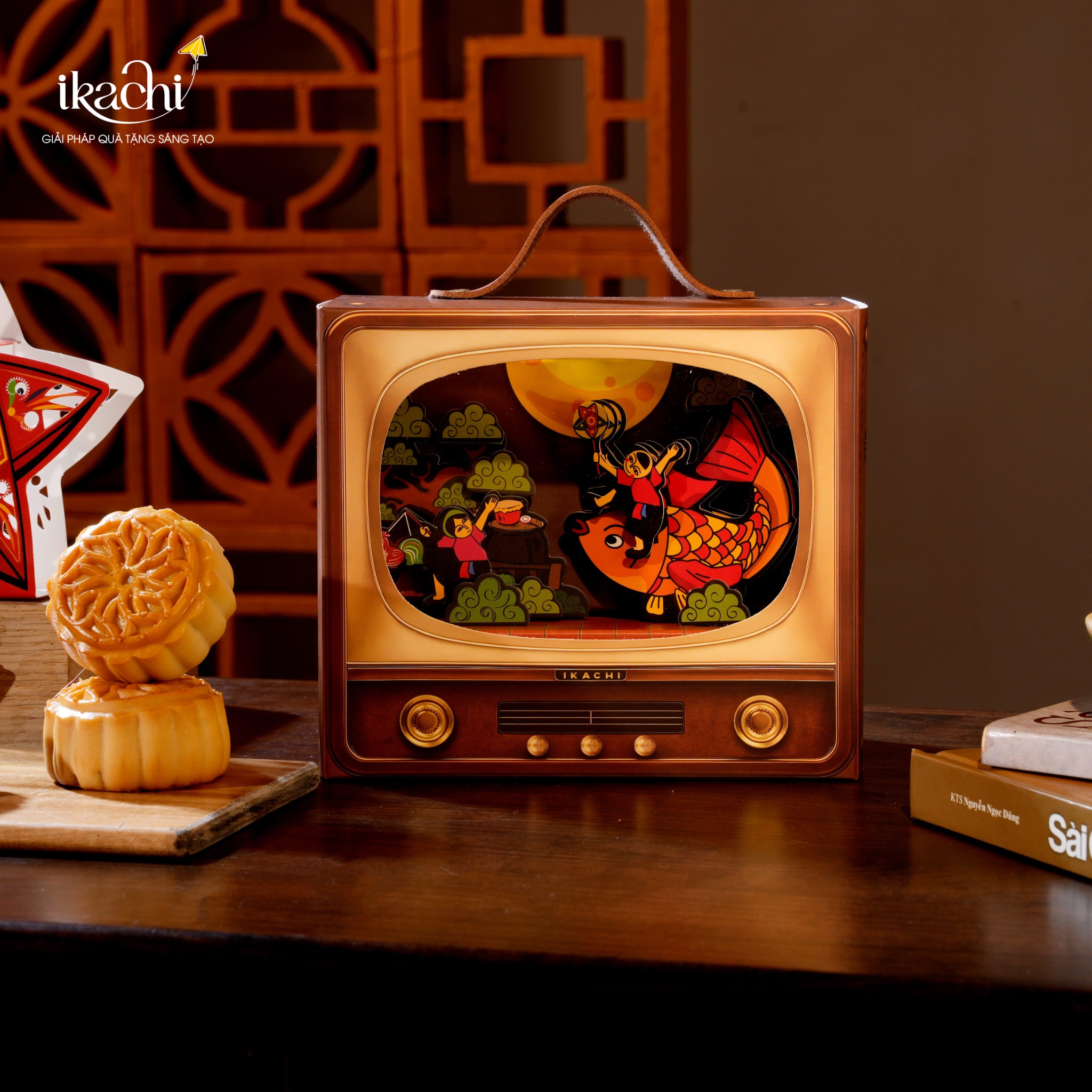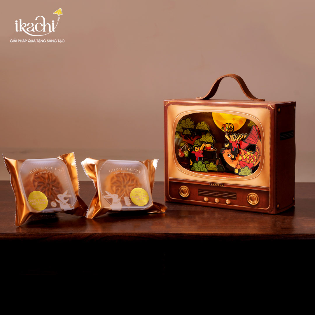 Hộp quà "Truyền Hình Tí Hon – Rước Đèn" là bức tranh thu nhỏ sống động về đêm Trung thu truyền thống – nơi những kỷ niệm tuổi thơ được tái hiện qua khung hình chiếc tivi xưa. Dưới ánh trăng tròn vằng vặc, trẻ em nô nức rước đèn đủ màu sắc rực rỡ, cưỡi cá hóa rồng, tiếng cười giòn tan vang vọng khắp phố phường.
