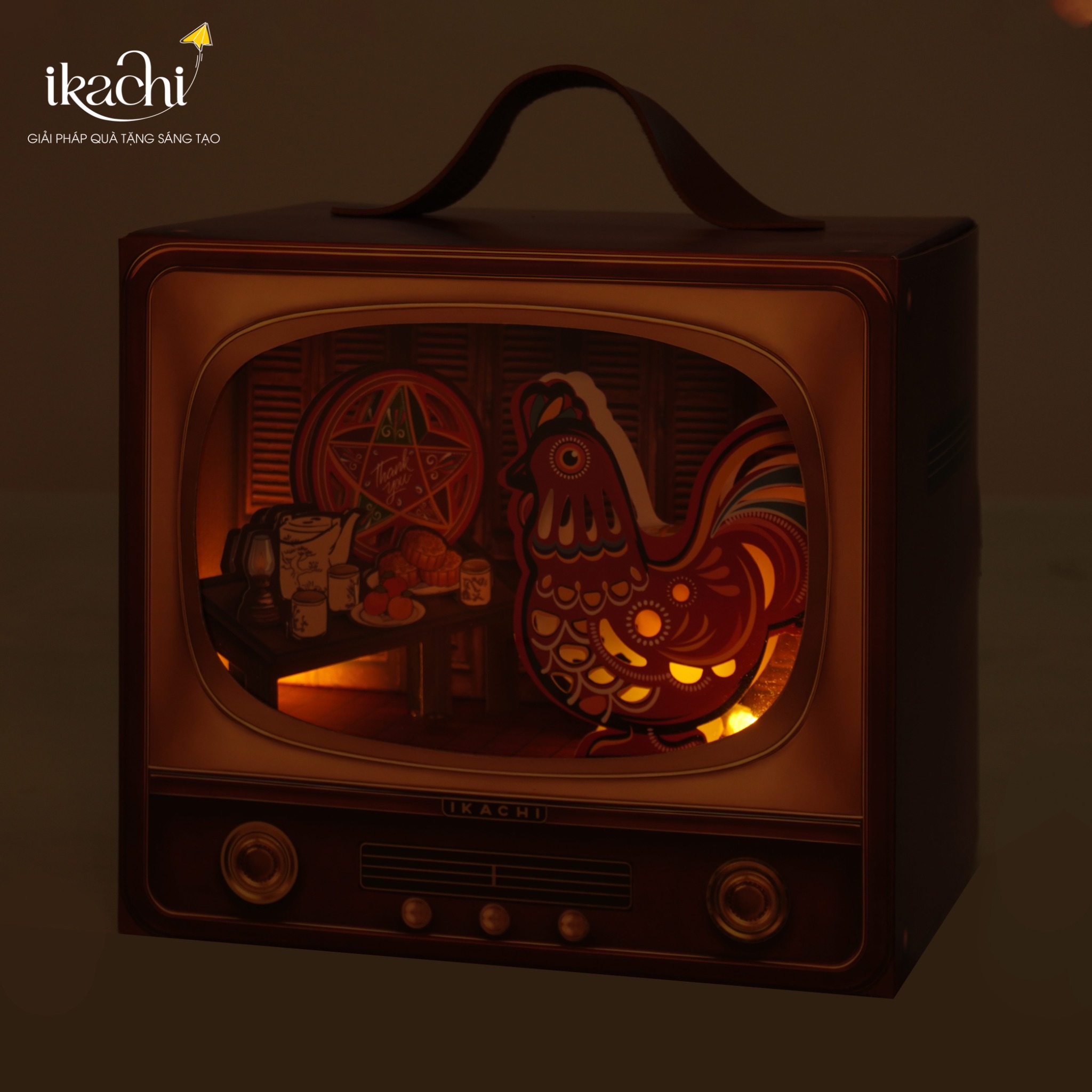 "Truyền Hình Tuổi Thơ Xanh" là món quà Trung thu được Ikachi thiết kế như một chiếc tivi cũ – nơi tuổi thơ sống lại qua từng hình ảnh giản dị mà thân quen. Đó là chiếc đèn giấy kiếng lấp lánh hình ngôi sao, bướm, gà, thỏ... từng khiến bao đứa trẻ mê mẩn không rời mắt, là đĩa bánh nướng thơm lừng bên ấm trà đơn sơ; là chiếc đèn dầu nhỏ bé nhưng đủ thắp sáng cả một bầu trời ước mơ tuổi thơ… Một mùa trăng bình dị mà ấm áp, bình yên sau cánh cửa lá sách bạc màu gió sương.