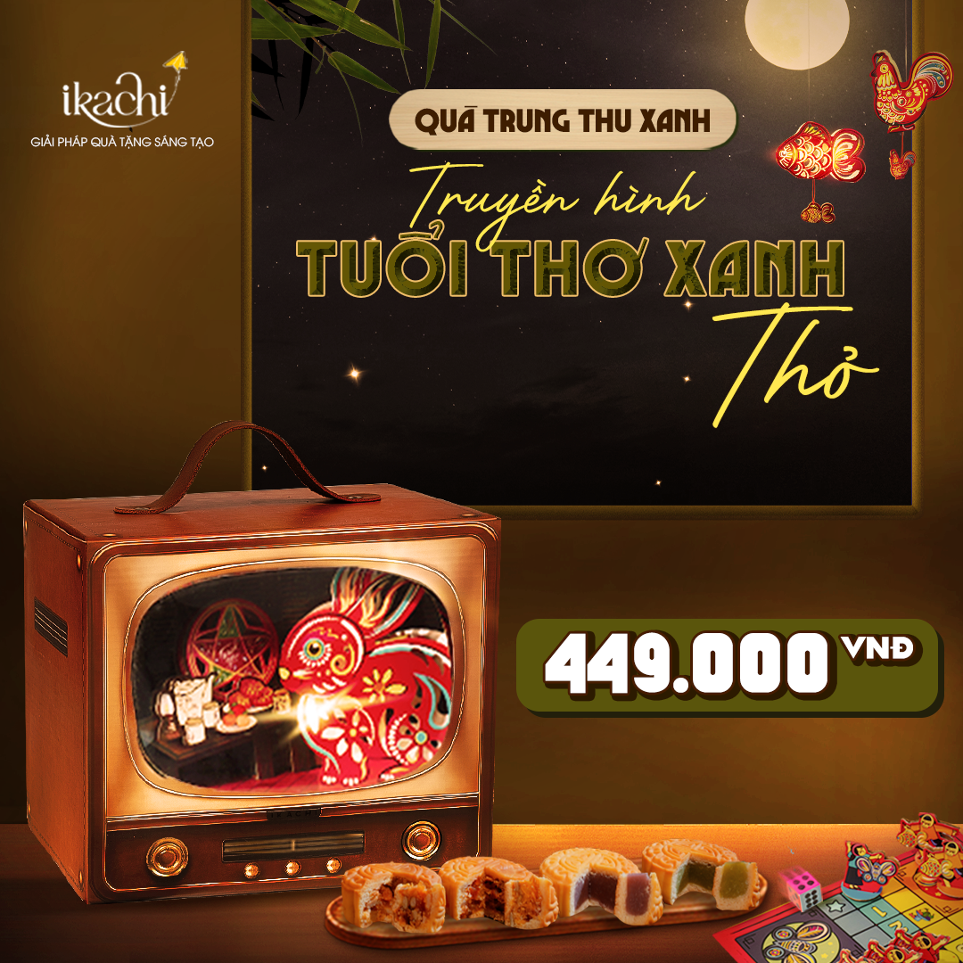 "Truyền Hình Tuổi Thơ Xanh" là món quà Trung thu được Ikachi thiết kế như một chiếc tivi cũ – nơi tuổi thơ sống lại qua từng hình ảnh giản dị mà thân quen. Đó là chiếc đèn giấy kiếng lấp lánh hình ngôi sao, bướm, gà, thỏ... từng khiến bao đứa trẻ mê mẩn không rời mắt, là đĩa bánh nướng thơm lừng bên ấm trà đơn sơ; là chiếc đèn dầu nhỏ bé nhưng đủ thắp sáng cả một bầu trời ước mơ tuổi thơ… Một mùa trăng bình dị mà ấm áp, bình yên sau cánh cửa lá sách bạc màu gió sương.
